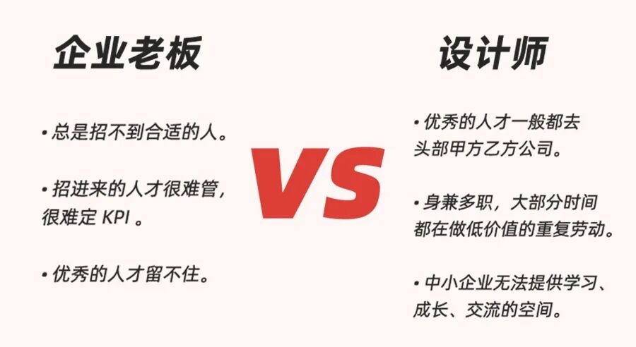 优秀的设计人才总是向上流动的。对于广大中小企业来说,很难以自身魅力吸引到优秀设计师。